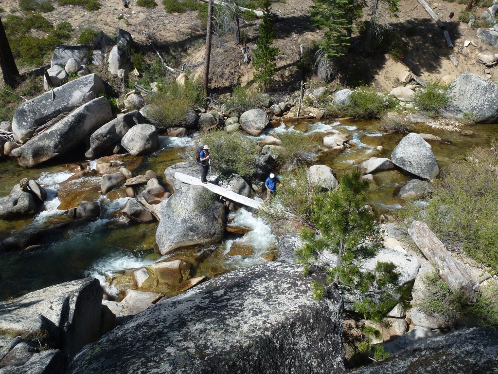 Banning and Diego scouting our log and rock crossing over Illilouette Creek.