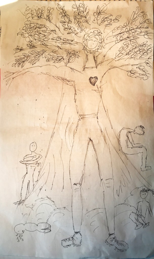 I woke when it was still dark as seen through the high windows in my room. The shower in my room wouldn’t warm up so I gave up. I was uncertain how to operate it. No knobs to hang yourself from.. None of the other patients were up. Breakfast wasn’t until eight. Tears were again gathering in my eyes. They were changing shift at the nurses’ stationI asked for a piece of paper to write on. Might as well journal and document this experience, I thought. There was a plastic jar of pens on the counter. They were like clear Bic pens only they were flexible. Nope, couldn’t stab anyone with one of these. I asked for a cup of tea (you had to ask for everything) and sat at a small white built-in shelf of a desk and drew a picture and sobbed.