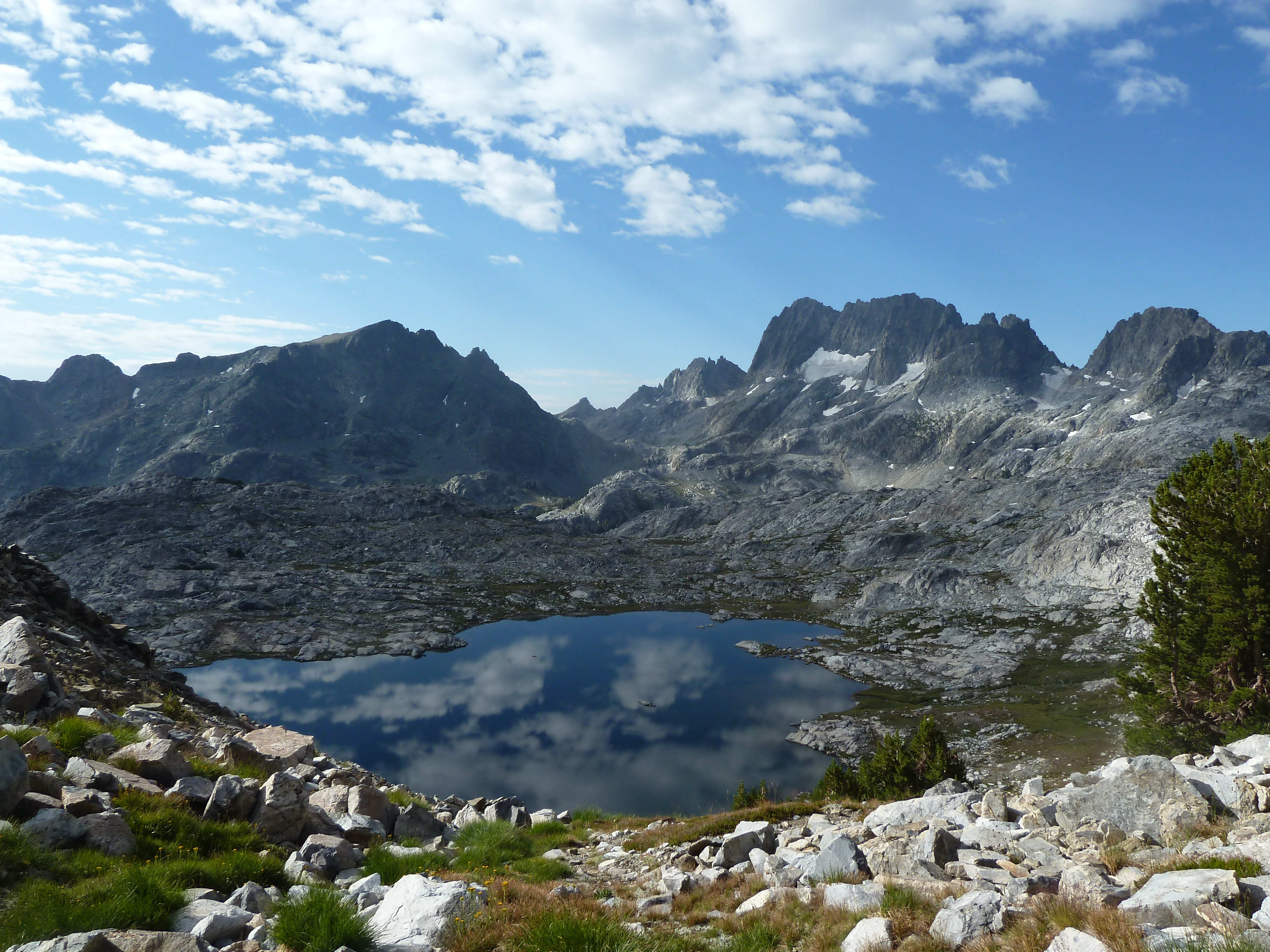 Carolyn and I got separated in the downpour. While there were no trees to get lost behind, there were Volkswagen-size boulders. “Carolyn! Carolyn!” I shouted in the maelstrom. No answer. The pass was straight ahead and there was a lake off to our right in a steep basin below. I was determined to make it over the 10,530-foot pass and down the other side to our day’s destination.